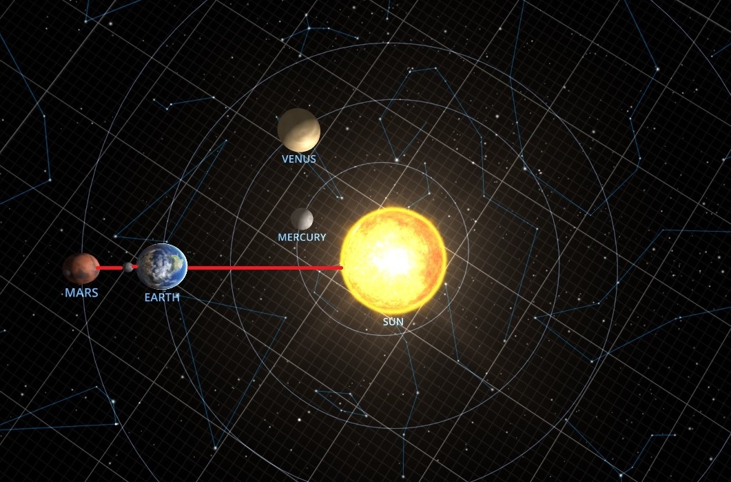 Mars opposition, when the Red Planet lies opposite the Sun in our sky, occurs about every two years. Mars opposition on 27 July 2018 will be near its closest approach to the Sun, making it the most favorable opposition for skywatchers since 2003. This video from NASA gives an excellent explanation of Mars opposition.